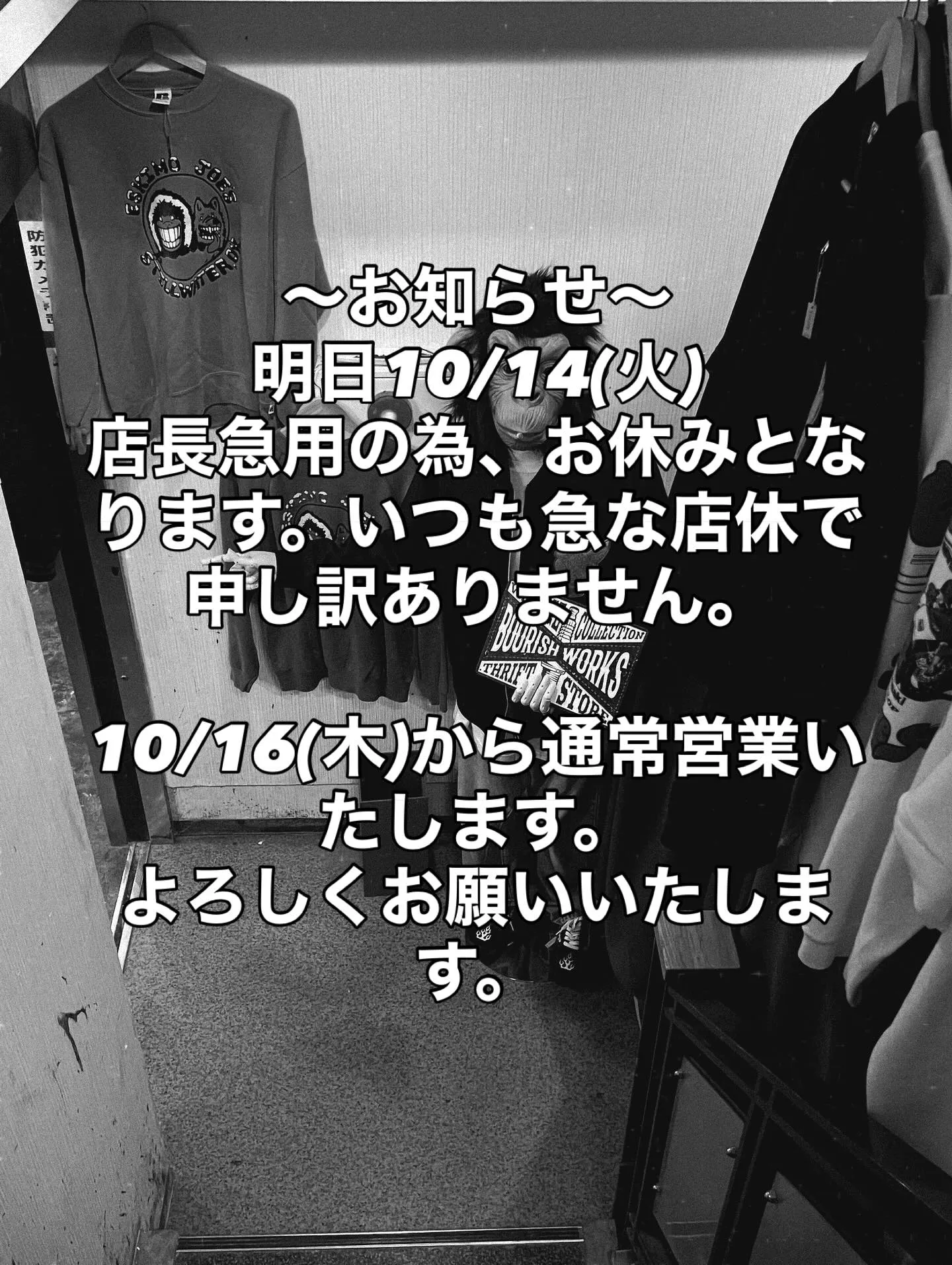 ~お知らせ~ 2025/10/13 ~お知らせ~ 10/14(火) 店長急用の為、お休みとなります。 いつも急なお休みで申し訳ありません。 10/16(木)11:00より通常営業となります。 よろしくお願いいたします。