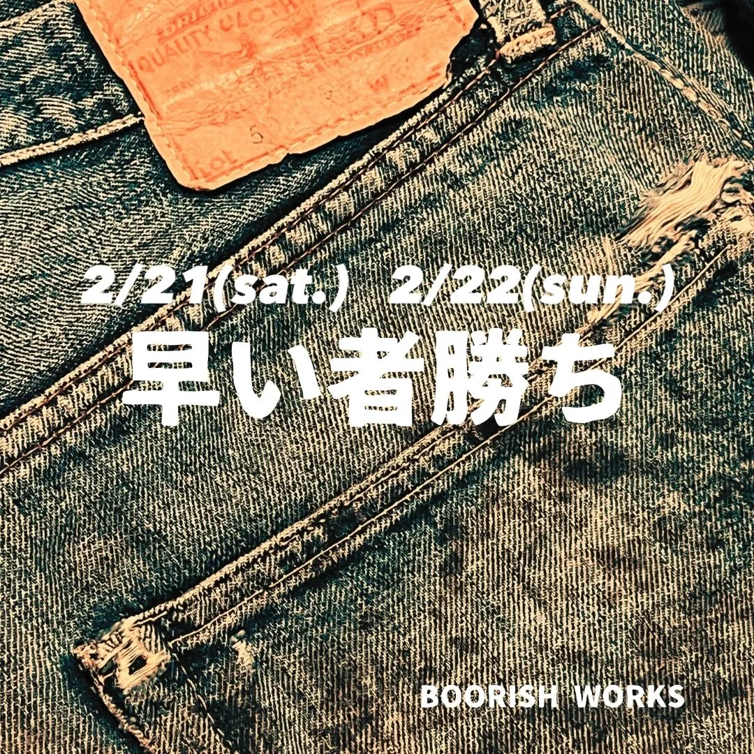 2/21(sat.)、2/22(sun.) BOORISH WORKS 早い者勝ち。